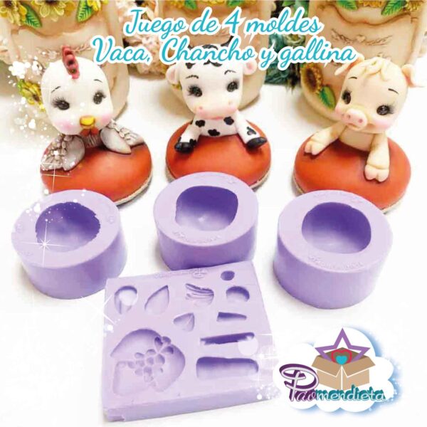 Molde de silicona para todos los usos, juego de 4 moldes: cabeza de vaca, chancho, gallina e implementos.